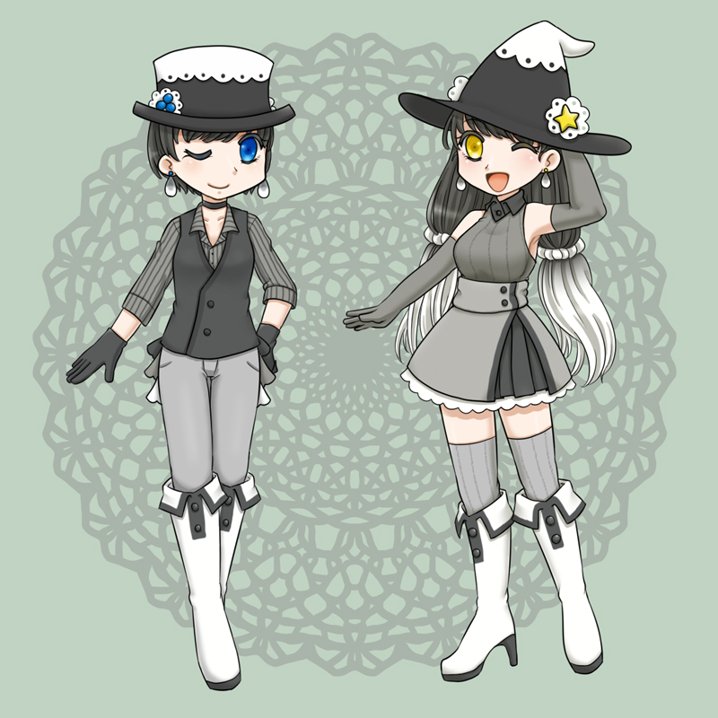魔法使いの一族に連なる双子の姉妹。 アフータドヌッグン出身、ニンブグイーを卒業して間もない魔法使い。 基本的に二人でFs2に参加している他、チーム戦に混ざっていることもある。 ごく稀にFs1に参加することも。ランクは中の下あたり。 目的が「楽しむ」ことなので、ランクの高さやポイントにそれ程執着がない。 試合以外はショッピングエリアに居ることが多い。勿論他人の試合観戦もする。 〇イェーナ 19歳/162cm(+ヒール5cm) あたし/キミ 勇敢な性格、ちょっぴり見栄っ張り フルネームはイェーナ・ファンタジカ。 楽しいことや新しいものが好き。目立つのも大好き。 自分のことを可愛いと思っているタイプで、敵を作りやすいが気にしていない。 学校を卒業した後の事を考えている時に偶々アークのことを知り、何それ面白そう!と飛びついた。 「ブルーネルが助けてくれないと勝てな〜い」と言ってFs1にはあまり参加したがらない。 「双子の美人魔法使い、イェーナ&ブルーネルで〜す」 「ちょっとぉ、いくらあたしが可愛いからって、こっちばっかり狙わないでくれる!?」 〇戦闘方法 主に攻撃役を担う。魔法が主で、特に武器などは必要としない。 ・マジカルシャイン(主な攻撃魔法) ・ドレインキッス(投げキッスから飛んだハートが相手に当たって体力を吸い取る) ・マジカルフレイム(相性不利な相手に使う攻撃魔法) ・デコレーション(味方強化用の魔法。たまに使う) 〇ブルーネル 19歳/162cm(+ヒール5cm) 私/君 せっかちな性格、暴れるのが好き フルネームは、ブルーネル・ファンタジカ。 綺麗なものを眺めたり、可愛いものを愛でたりするのが好き。人を着飾るのも好き。 それと同じくらいバトルも好きだが、スイッチが入ると手が付けられない為普段はサポート役をしている。 新しい魔法を覚えるとすぐに試したくなるタイプで、イェーナからアークに誘われ二つ返事で同行した。 時々Fs1で思いっきり攻撃魔法を使って清々しい笑顔を浮かべている。勿論サポートも楽しい。 「前置きはいらないよ、早速始めよう? どんなバトルになるか楽しみだね」 「アハハ、サポートも楽しいものだよ。……勿論、たまには息抜きだって必要だけど」 〇戦闘方法 Fs1以外では主に補助役を担う。魔法が主で、特に武器などは必要としない。 ・デコレーション(味方強化用の魔法) ・てんしのキッス(投げキッスから飛んだハートが相手に当たって混乱させる) ・しんぴのまもり(状態異常予防。魔力のベールができる) ・マジカルフレイム(相性不利な相手に使う攻撃魔法) |